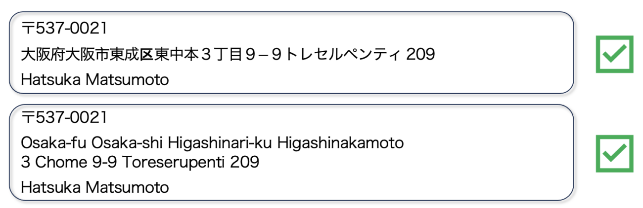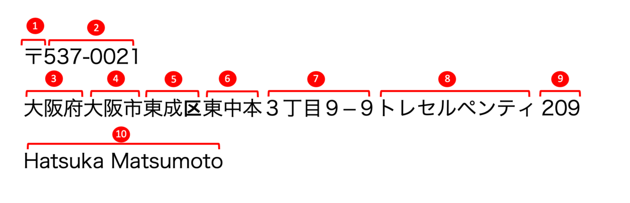 Kebalikan dengan format alamat di Indonesia, penulisan alamat di Jepang dimulai dengan kode pos, provinsi, kota, kelurahan, nomor blok, kemudian nama gedung dan nomor kamar. Untuk nama penerima biasanya ditulis di bawah baris alamat.
