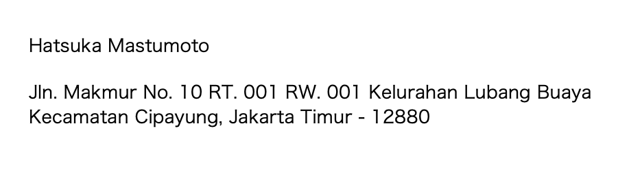 Nah itu dia urutan format penulisan alamat di Jepang. Jangan sampai salah lagi ya… Apalagi menggunakan bahasa Indonesia dalam penulisan alamatnya, karena UMin sering banget dapat order tapi dengan format alamat dan bahasa Indonesia, seperti contoh di bawah ini: