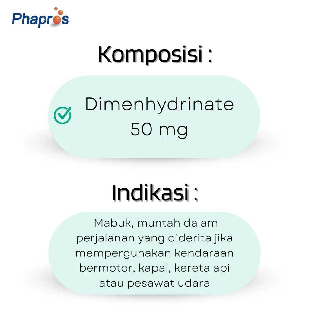 Tiap tablet berisi : Dimenhydrinate 50 mg