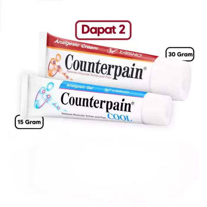 Counterpain Cool 15 gr : Mengandung Methyl salicylate, menthol, eugenol yang merupakan gel sejuk dan tidak lengket yang digunakan untuk meredakan nyeri otot dan nyeri sendi.