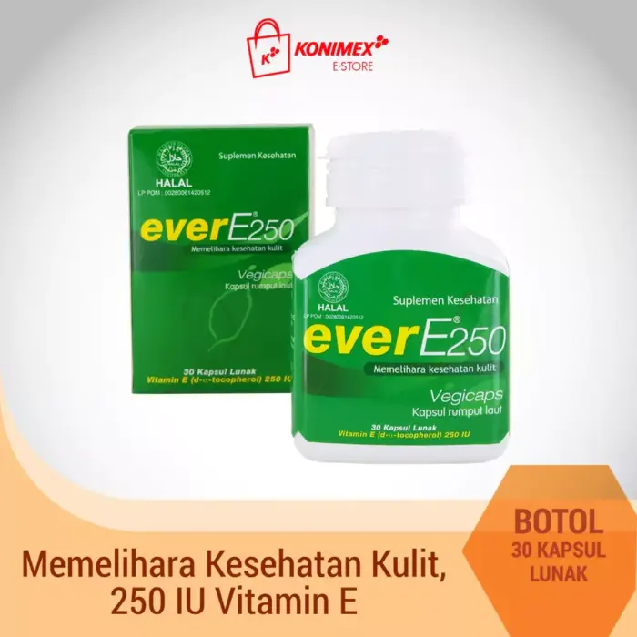Mengandung 250 IU vitamin E D – Alpha Tocopherol tunggal dan berbalut cangkang rumput laut yang bekerja untuk memelihara kesehatan kulit, dan cukup dikonsumsi 1 kapsul per hari. Ever E tersedia dalam kemasan botol isi 30 soft capsule, strip isi 6 soft capsule dan strip isi 12 soft capsule. POM SI. 044 313 951 (kemasan botol), POM SI. 044 314 141 (kemasan doos dan amplop).