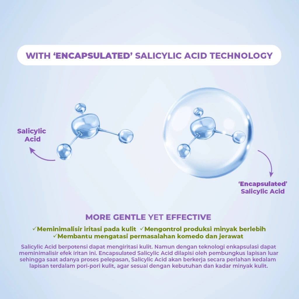 Encapsulated Salicylic Acid: Mem Penetrasi kedalam kulit secara lembut, melawan jerawat dab minim menimbulkan iritasi sehingga dapat menjaga kulit bersih & sehat