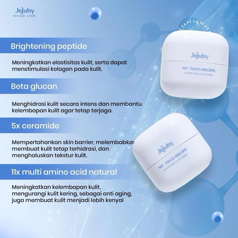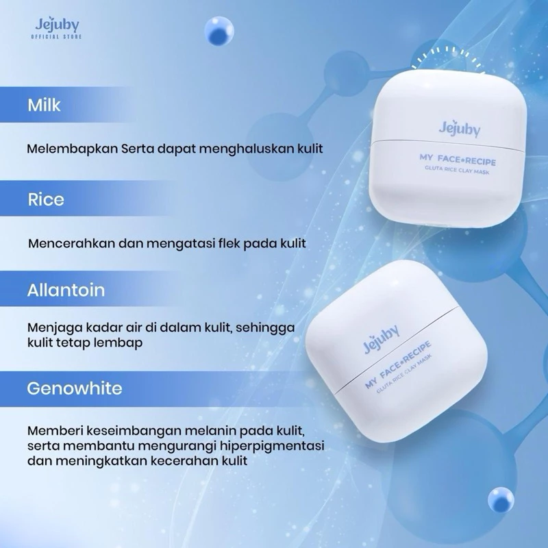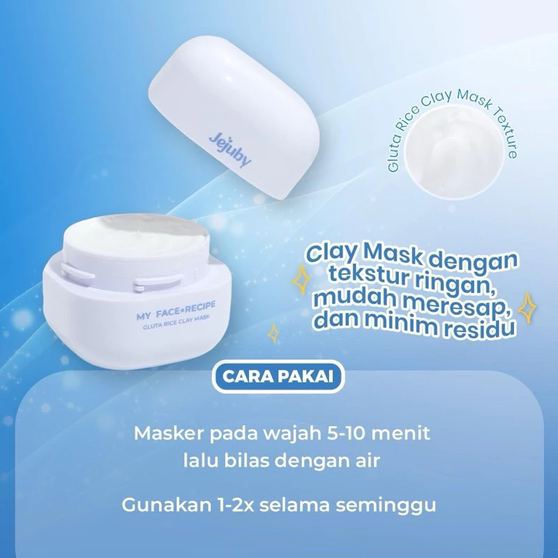 EJUBY Gluta Rice Clay Mask dapat mengangkat sel kulit mati serta mengandung Genowhite️, Milk dan Glutathione yang dapat mencerahkan dan meratakan warna kulit. Dilengkapi dengan 5X Ceramide, Sodium PCA, Rice Extract, Allantoin dan Natural Prebiotic yang membantu menjaga skin barrier, kelembapan alami kulit serta membuat kulit terlihat lebih halus dan lembut.