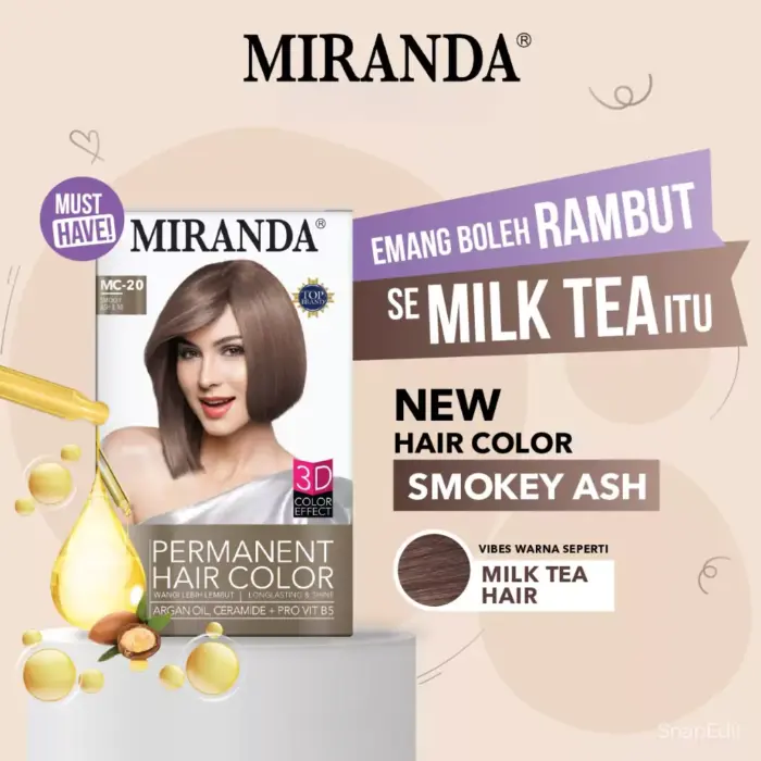 Cat rambut warna Smokey Ash yang dilengkapi dengan kondisioner yang melindungi warna rambut, hasil pewarnaan merata ke seluruh rambut (tergantung pengaplikasian), dapat digunakan untuk menutupi uban.