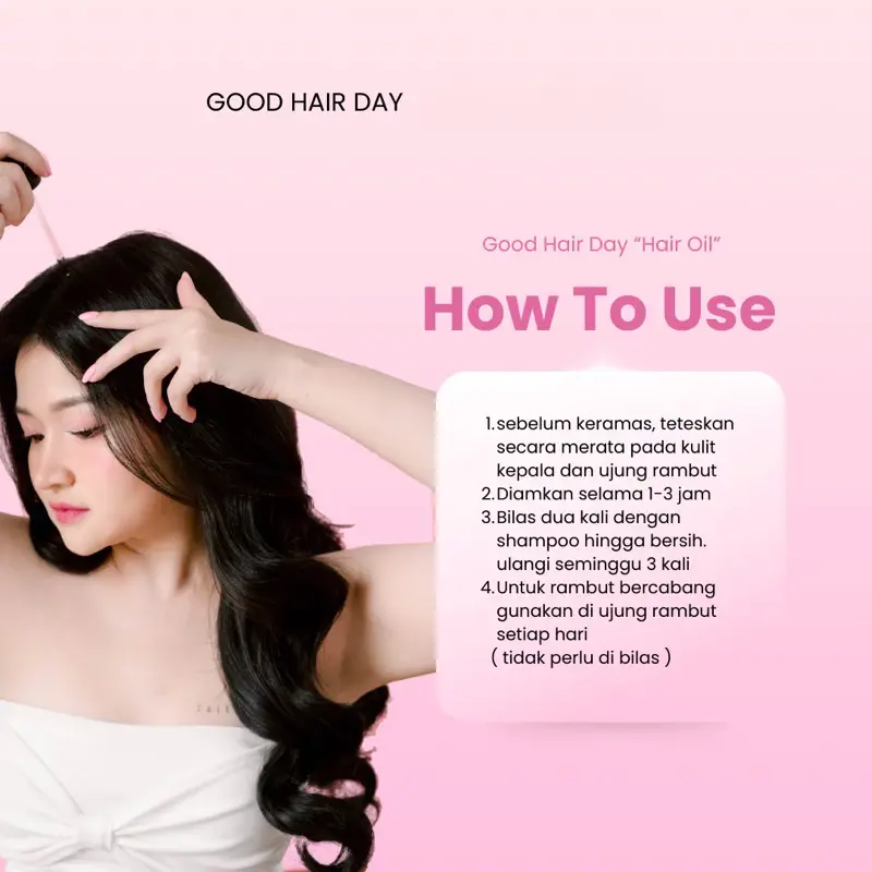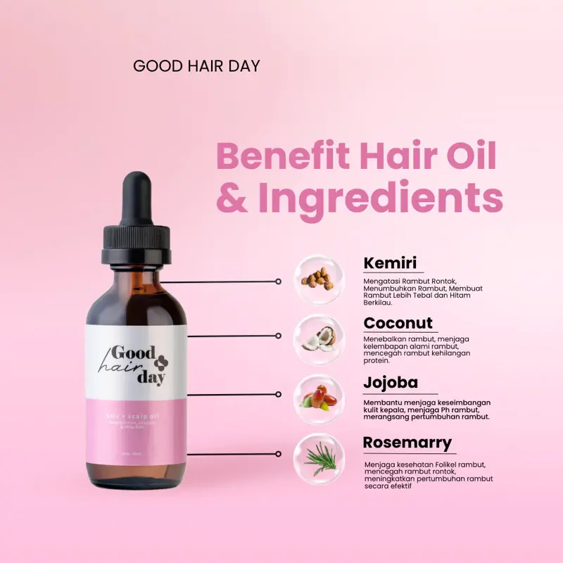 Hair oil GOOD HAIR DAY NEW FORMULA WITH ROSEMARY, KEMIRI, JOJOBA & COCONUT OIL yang sangat bagus untuk pertumbuhan rambut & membuat rambut tampak sehat berkilau.