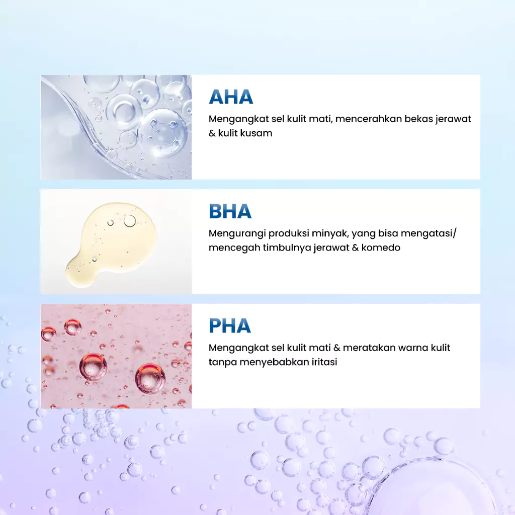 Mengangkat sel kulit mati, mencerahkan dan menghaluskan kulit, menghidrasi kulit Antioxidant