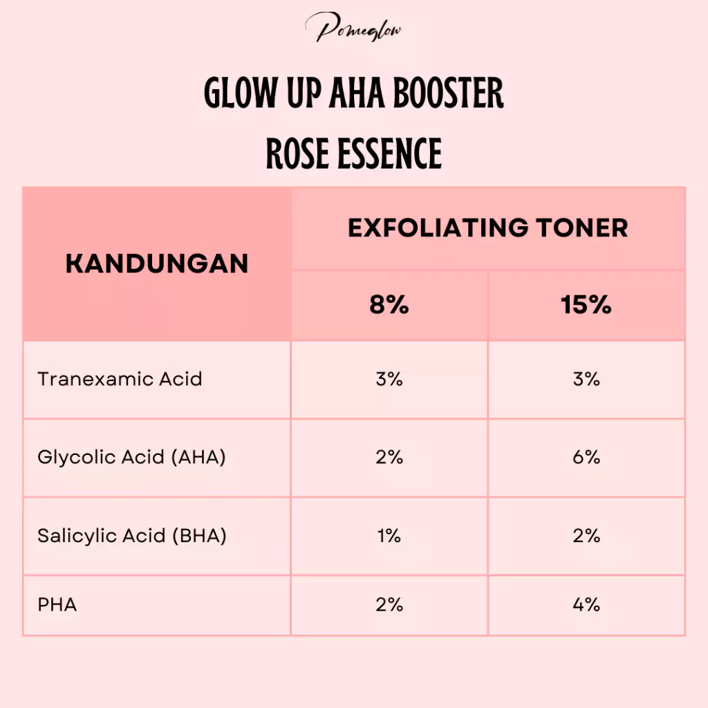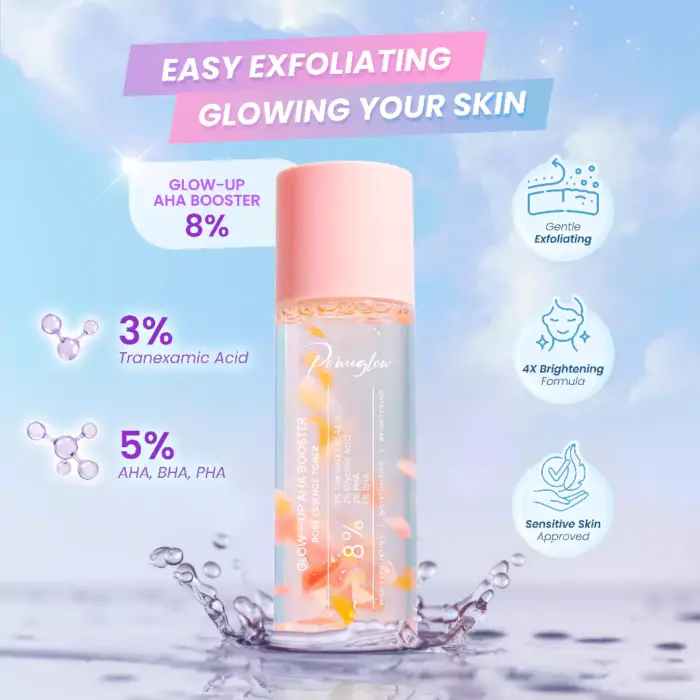 Exfoliating toner face and body dengan formula yang gentle dan 4x brightening menjadikan Pomeglow Glow Up AHA Booster sebagai toner eksfoliasi yang tepat untuk mengangkat sel kulit mati dan mencerahkan serta aman digunakan untuk kulit sensitif