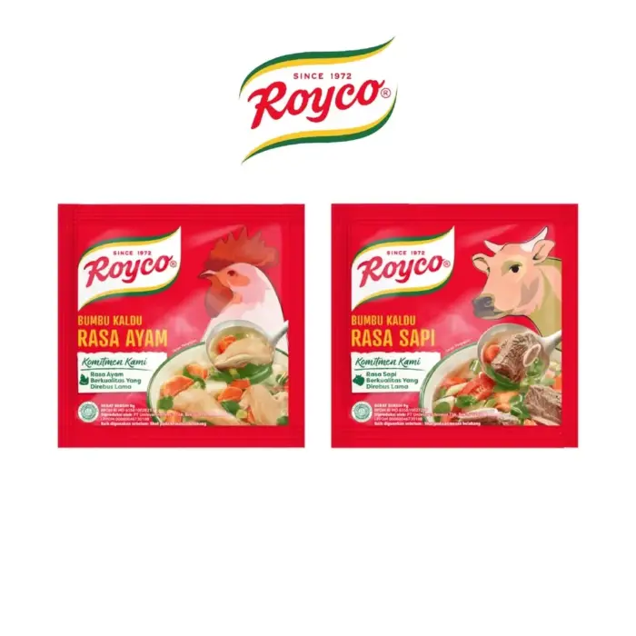 Bumbu penyedap makanan dengan cita rasa yang kaya untuk membawa semangat memasak kepada semua orang. Royco Kaldu Ayam/Sapi dibuat dengan daging Ayam/sapi yang direbus lama memberikan kaldu mantap dan rasa daging lezat untuk semua masakan. Royco menghadirkan berbagai produk makanan/masakan untuk membantu para ibu menghidangkan makanan kegemaran keluarga