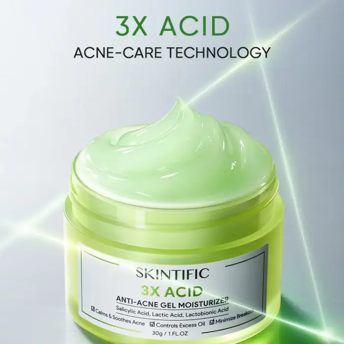 SKINTIFIC 3X Acid Anti-Acne Gel Moisturizer merupakan produk perawatan jerawat yang ampuh dengan perpaduan dan gabungan tiga acid dalam satu produk yaitu Salicylic Acid, Lactobionic Acid dan Lactic Acid. Yang fokus untuk membantu permasalahan jerawat seperti menyamarkan noda jerawat, meredakan jerawat dan menenangkan kemerahan untuk menjaga kulit tetap sehat dan bersih dari jerawat.