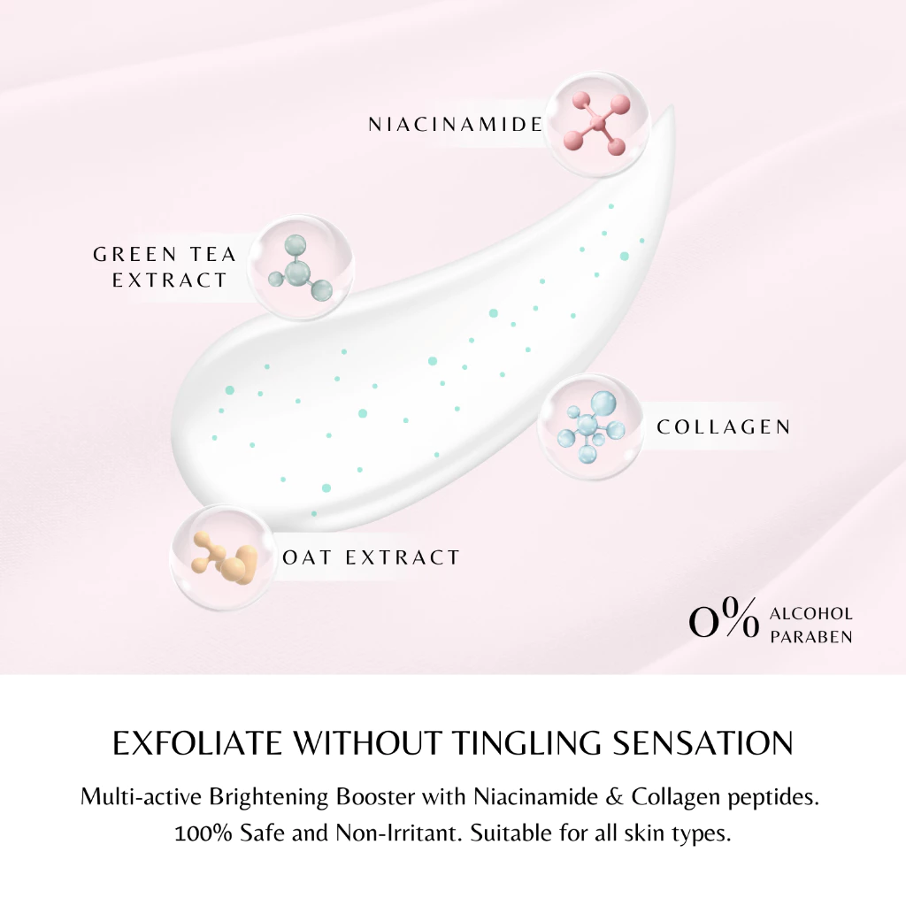 Dengan BOOSTER SERUM PENCERAH Tinggi setara serum wajah efektif mencerahkan, mengurangi noda hitam, serta meratakan warna dan tekstur kulit. Untuk hasil maksimal, diamkan 5-15 menit di badan sebelum dirontokkan.