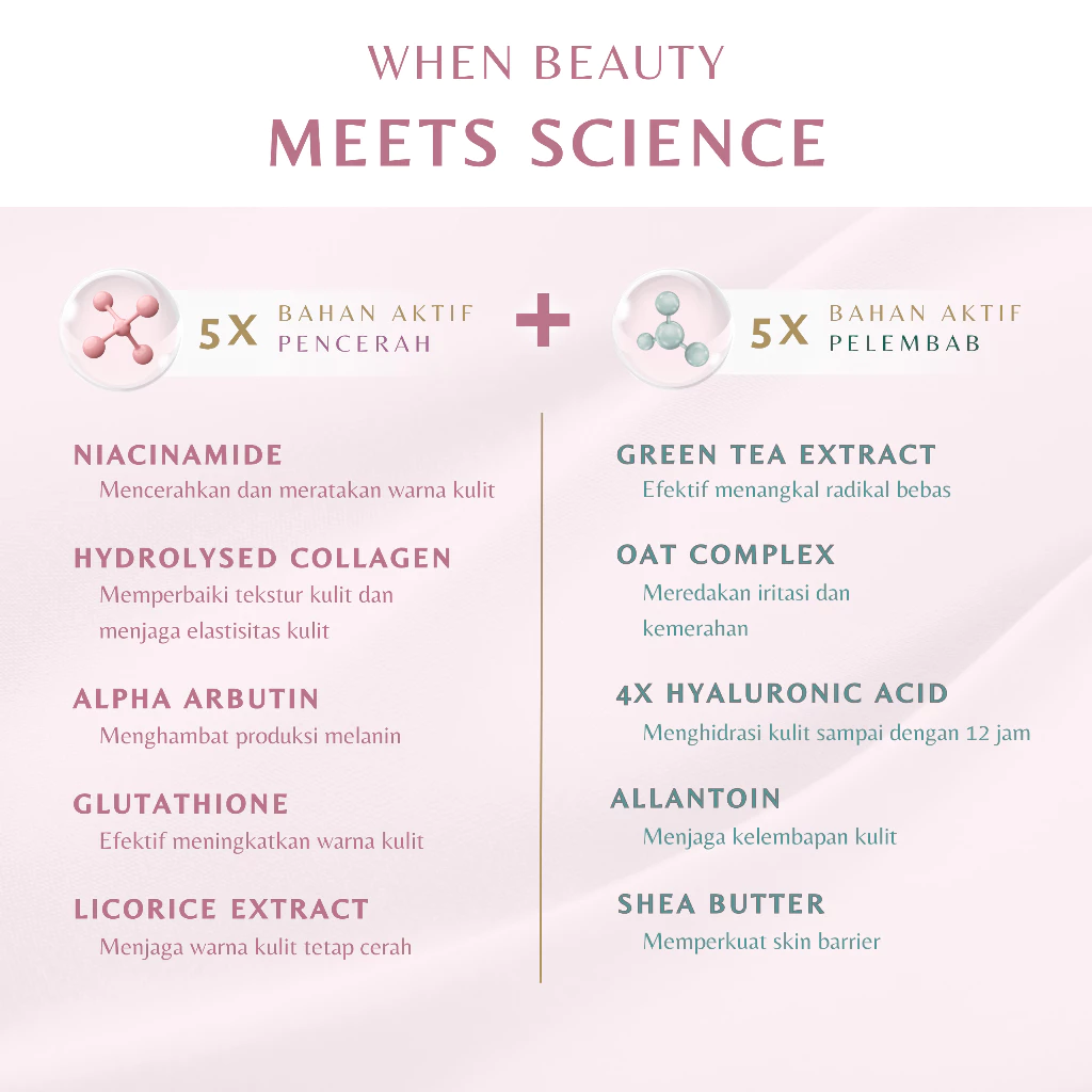 Dilengkapi 5x Bahan Aktif Serum Pencerah Kadar Tinggi & 5x Agen Pelembab. Lebih ampuh mencerahkan secara merata sampai ke lipatan sekaligus menghidrasi & memperbaiki skin barrier