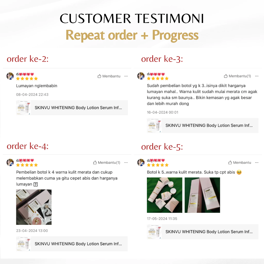 *Hasil bervariasi pada setiap jenis kulit, untuk hasil terbaik gunakan bersama Skinvu Body Scrub dan Sunblock sebelum keluar rumah pada siang hari