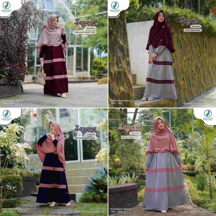 Zayana Dress Set ini adalah Gamis yang terdapat dua cut and sewn warna kombinasi dengan variasi motif embroidery pada bagian rok nya, lalu pada bagian cuff terdapat frill dan potongan cuff dengan warna kombinasi dan yang lebih cantiknya lagi Zayana Dress Set ini memiliki 2 bergo yang berbeda yaitu : Bergo Zoysia dan Bergo Wedelia Waahh elegant dan unik sekali yaah ukhti.
